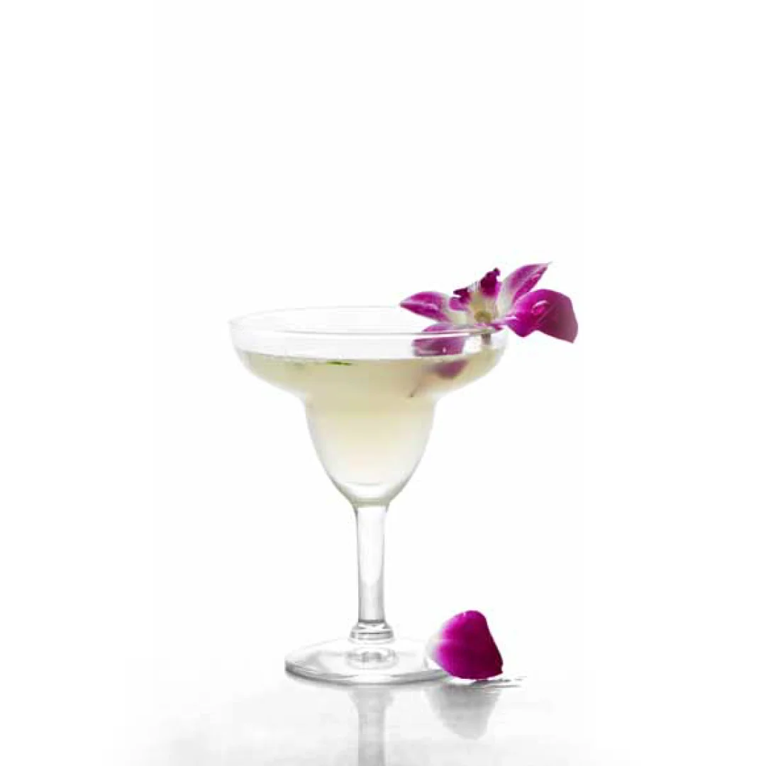 •  Alle Zutaten mit Eiswürfeln schütteln und mit einem Strainer in die Margaritaschale abseihen.