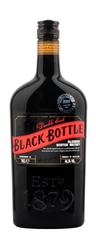 Der Black Bottle Double Cask Blended Scotch Whisky ist Resultat einer Assemblage zwei verschiedener Destillate: Ein im Sherry Cask ausgebauter Malt Whisky und ein im Rotweinfass ausgebauter Grain Whisky.