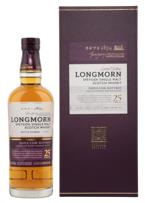 Dieser Whisky von Longmorn reifte während 25 Jahren in drei verschiedenen Fässertypen: Butts, Hogshead Casks und Fässern aus amerikanischer Eiche. Er wurde in Fassstärke als Single Malt Triple Cask Matured Limited Release auf den Markt gebracht.