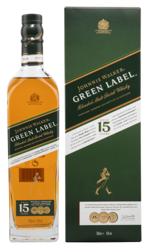 JOHNNIE WALKER GREEN LABEL wird aus einer Auswahl von Speyside, Highland, Lowland und Island Malts hergestellt, die mindestens 15 Jahre gereift sind. Damit bietet er den Charakter eines Single Malt Whiskys, jedoch mit grösserer Tiefe und einem breiteren Geschmackserlebnis.Seinen Charakter erhält er durch die sorgfältig ausbalancierte Komposition von Talisker, Linkwood, Cragganmore und Caol Ila.