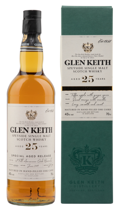 Die Basis des 25 Year Old Single Malt Scotch Whisky bildet ein Destillat aus Gerstenmalz. Dieses wurde von Hand in ausgewählte neue Fässer aus amerikanischer Weiss-Eiche gefüllt und lagerte 25 Jahre lang in den kühlen Hallen der Glen Keith Distillery, bevor es 2019 auf eine Trinkstärke von 43 % herabgesetzt in die Flasche kam.