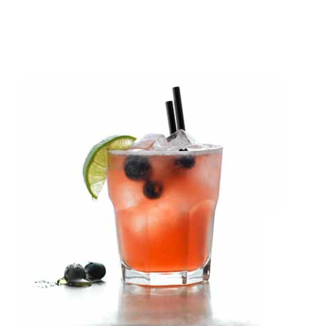 Alle Zutaten in einen Shaker mit Eis geben und kräftig schütteln. Mit einem Strainer in das Glas mit frischen Eiswürfeln absieben und mit Limette und Blaubeeren dekorieren.